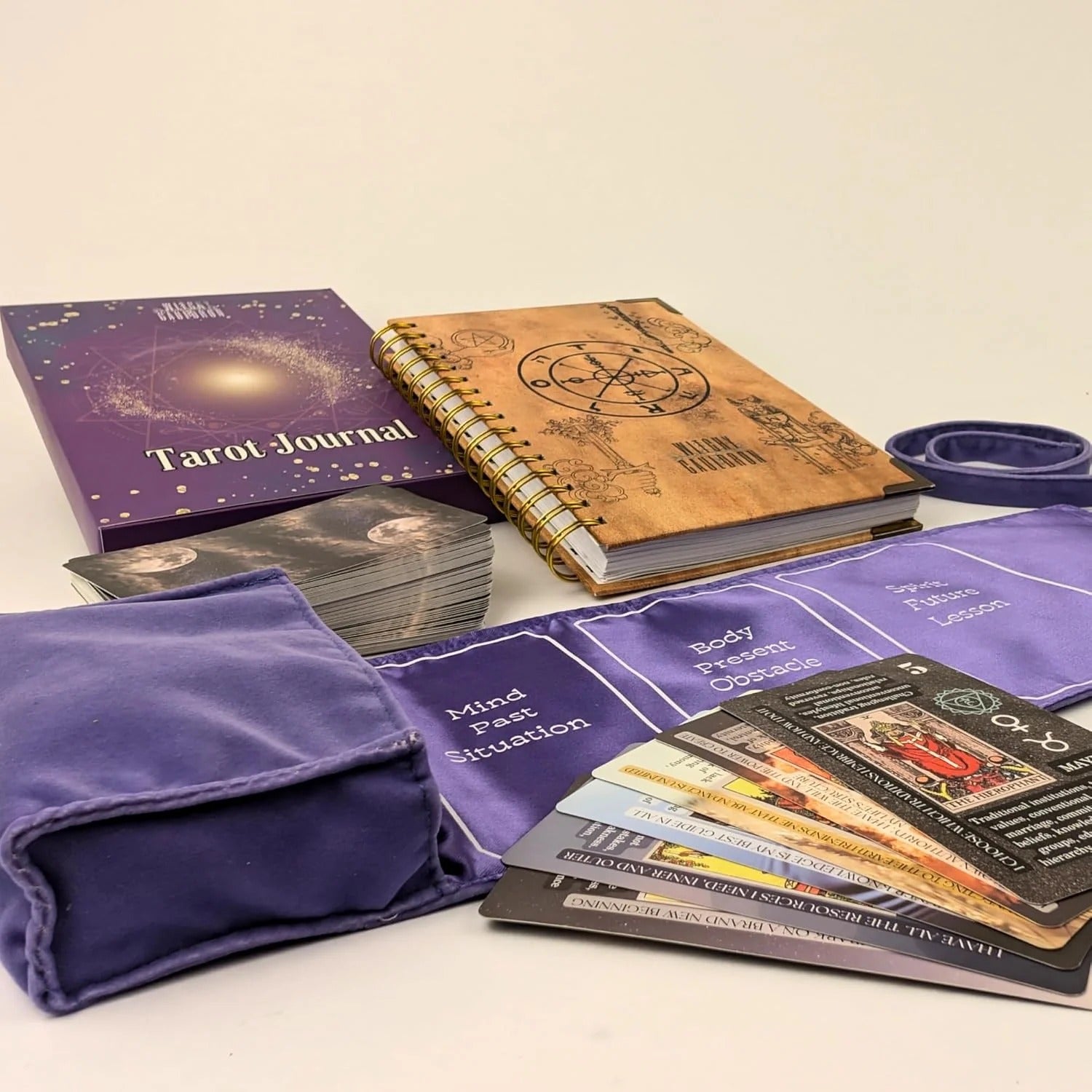 Includes a purple satin tarot wrap, tarot journal, and learning tarot deck for a perfect introduction to tarot.