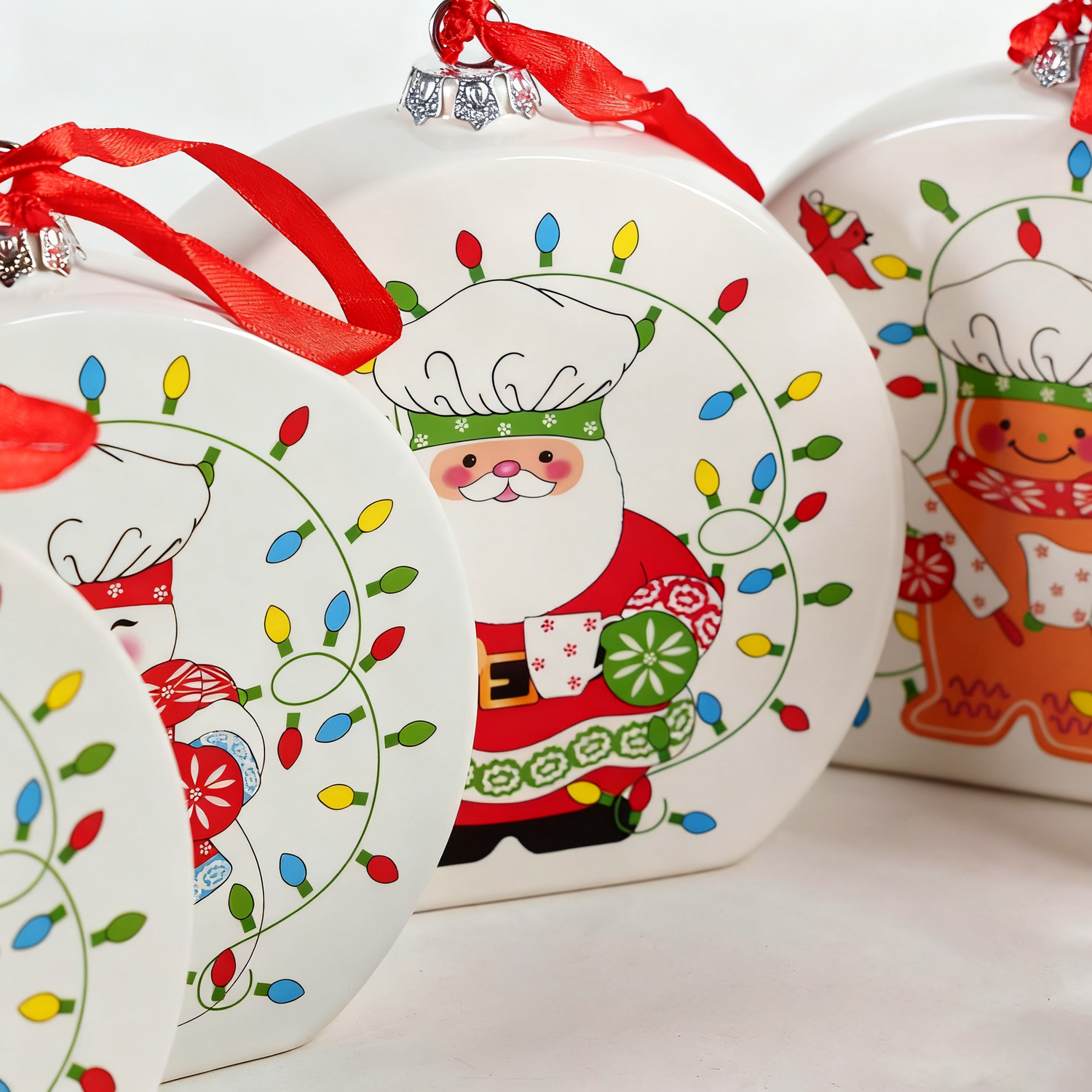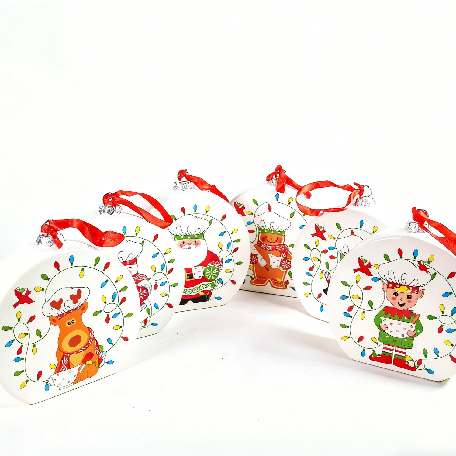 Our ornament set features a variety of beloved Christmas characters. From the jolly Santa Claus, dressed in his traditional red and white, to the cute reindeer, ready to help Santa on his sleigh ride. There's also an endearing penguin, snug in a green scarf and holding a festive mug, a cheerful elf carrying a present, a friendly snowman baking cookies, and a charming gingerbread man. Each character is depicted wearing a chef's hat, adding a fun and whimsical touch to the designs. Colorful Christmas lights encircle them, creating a vibrant and joyful atmosphere.