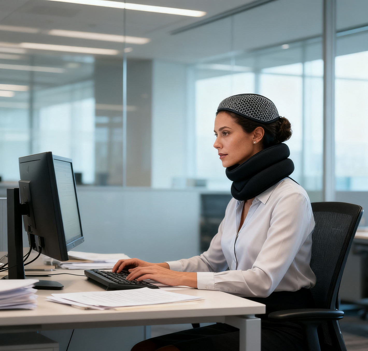 Not at all! It has a slim, ergonomic design that hugs your neck closely instead of sticking out. Most users say it’s “low-profile”—you can wear it at your office desk without it looking obvious, or even under a light sweater during travel. It doesn’t restrict your head movement much either, so you can still turn to talk to colleagues or look at your phone easily.