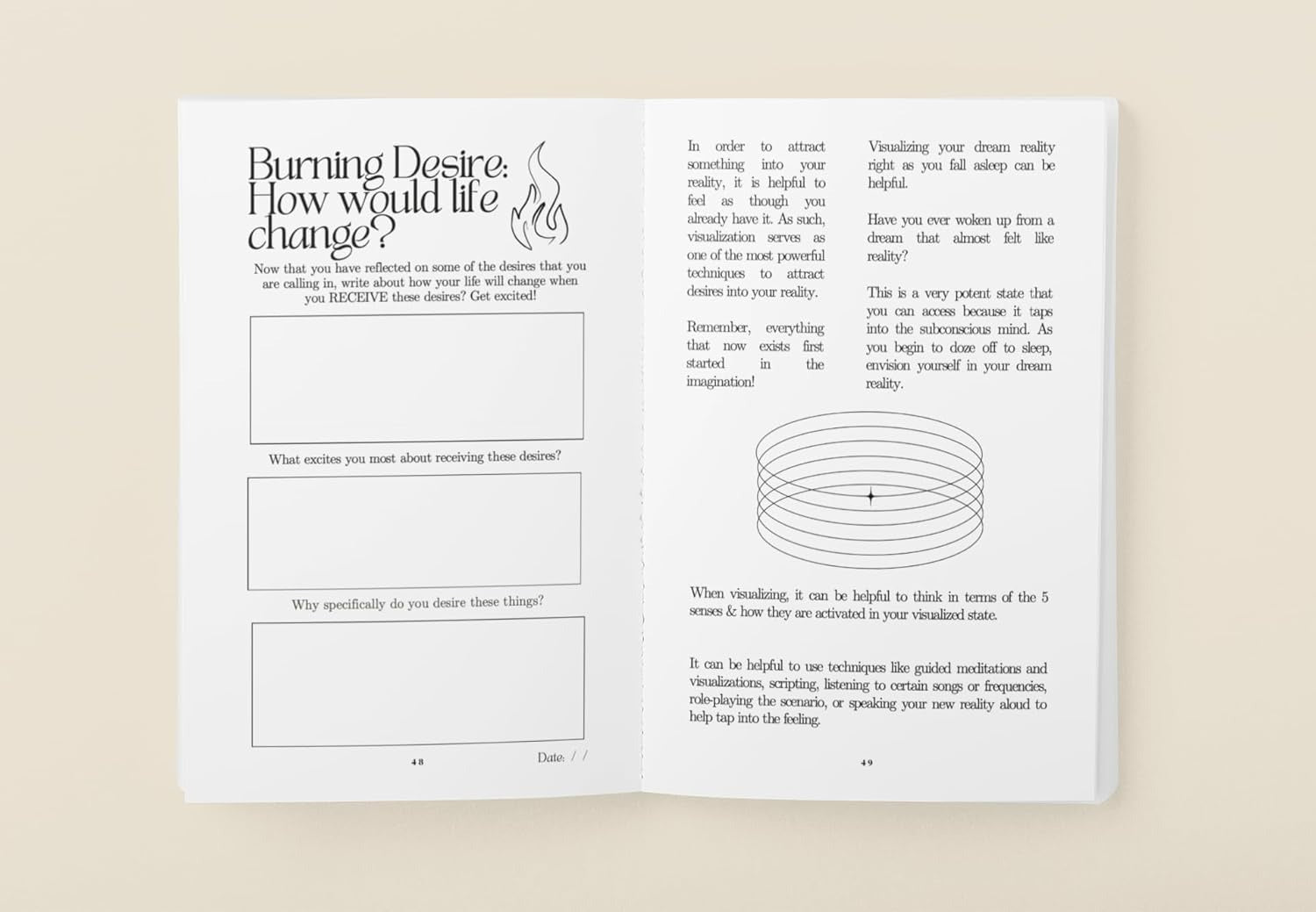 - Daily manifestation prompts: Define your intentions, visualize success, and reflect on progress.